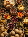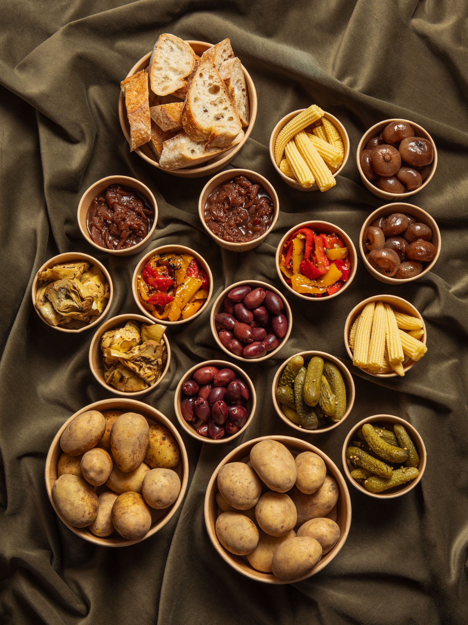Baked oven triplets, sourdough baguette, hummus, cornichons, Borettane onions, pickled artichokes, baby corn, kalamata olives.